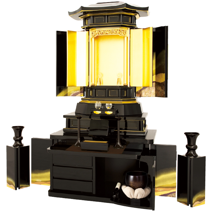 京都の風土に育まれた伝統、西陣織。その雅やかな美しき金箔は、至るところにに散りばめられ一面の春風をイメージしています。従来のお仏壇のイメージを一新させた息をのむ華麗な世界が祈りの瞬間を彩ります。