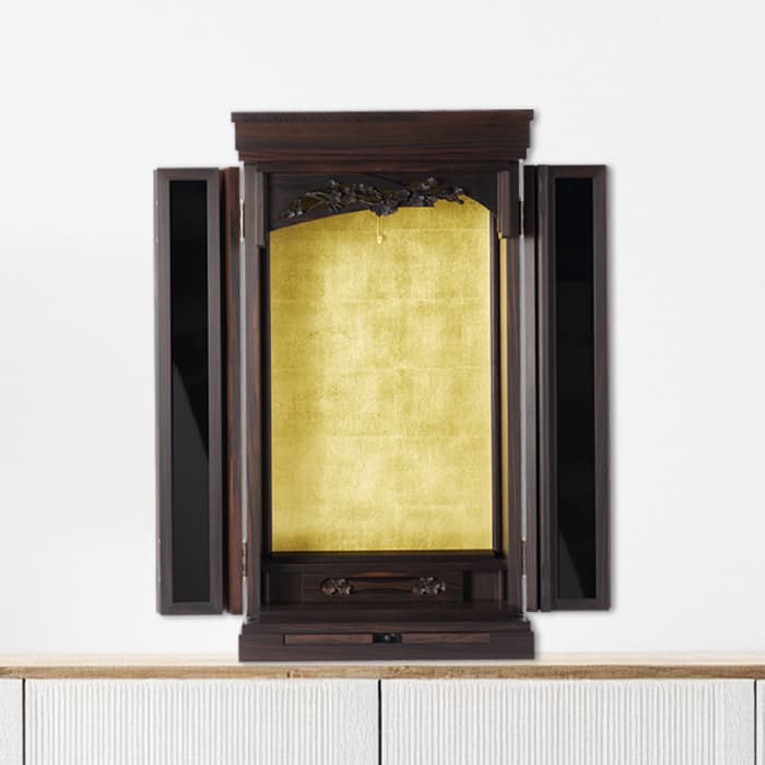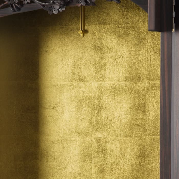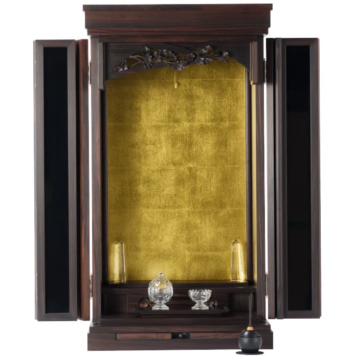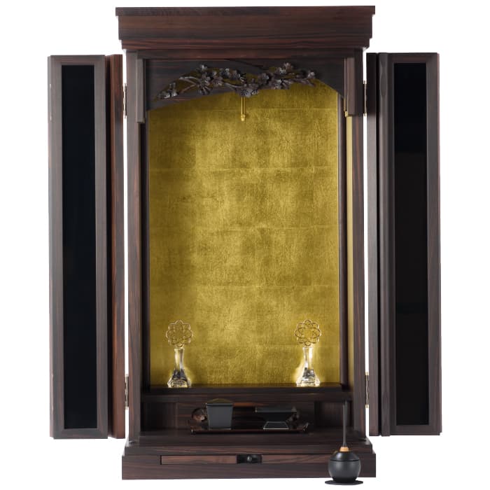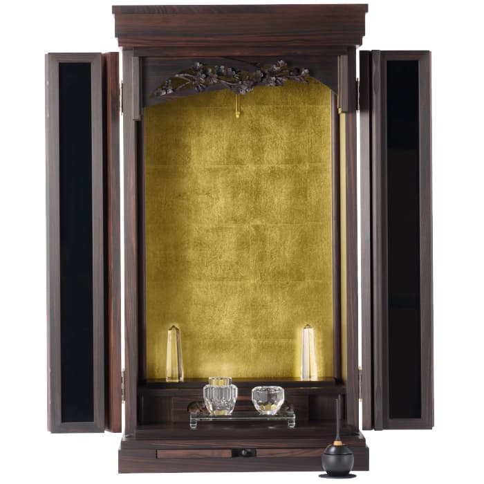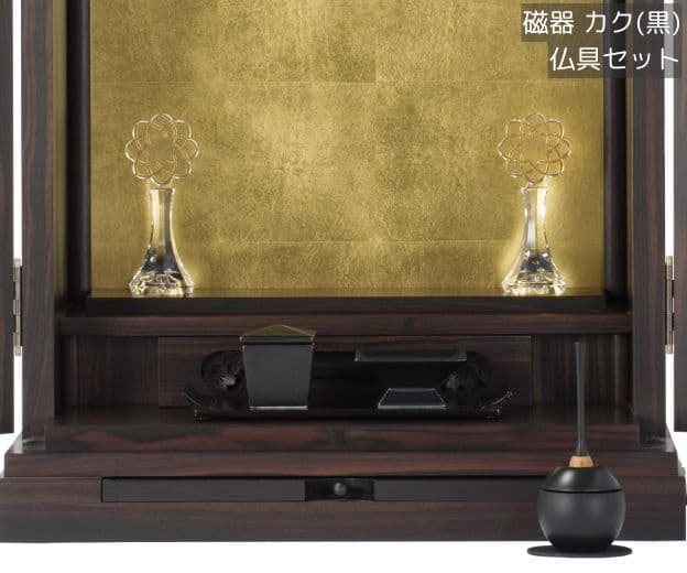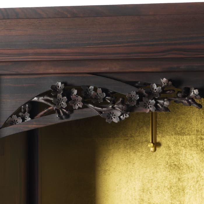 光沢を湛えた漆黒の扉は凛とした空気をまとい、本金箔の輝きは仏壇の外へも溢れ出るよう。小さなお仏壇ながら、御本尊様にしっかりと向き合いたくなる、心地よい緊張感を持ち合わせています。