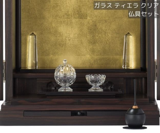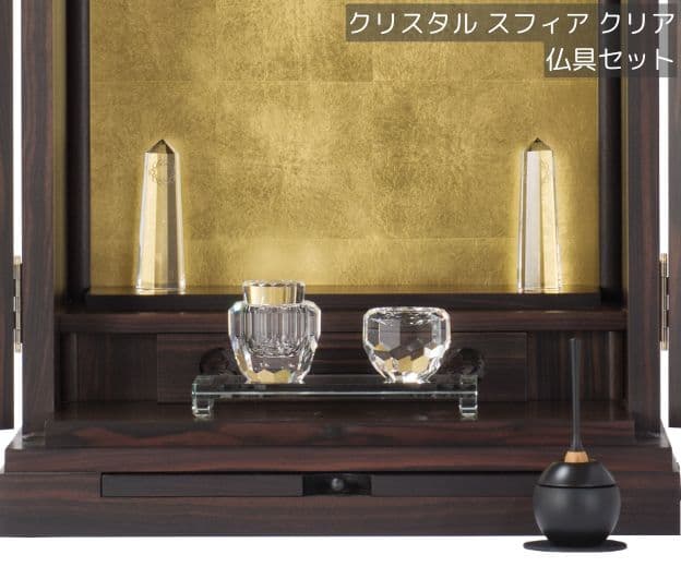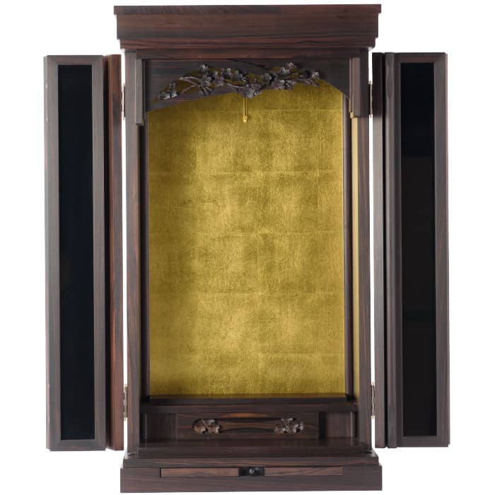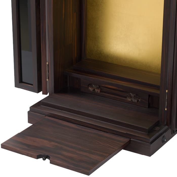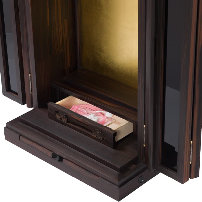 上置仏壇ながら引き出し付き。日々、ご利用になられるお念珠やお経本などを収納するのにとても便利です。