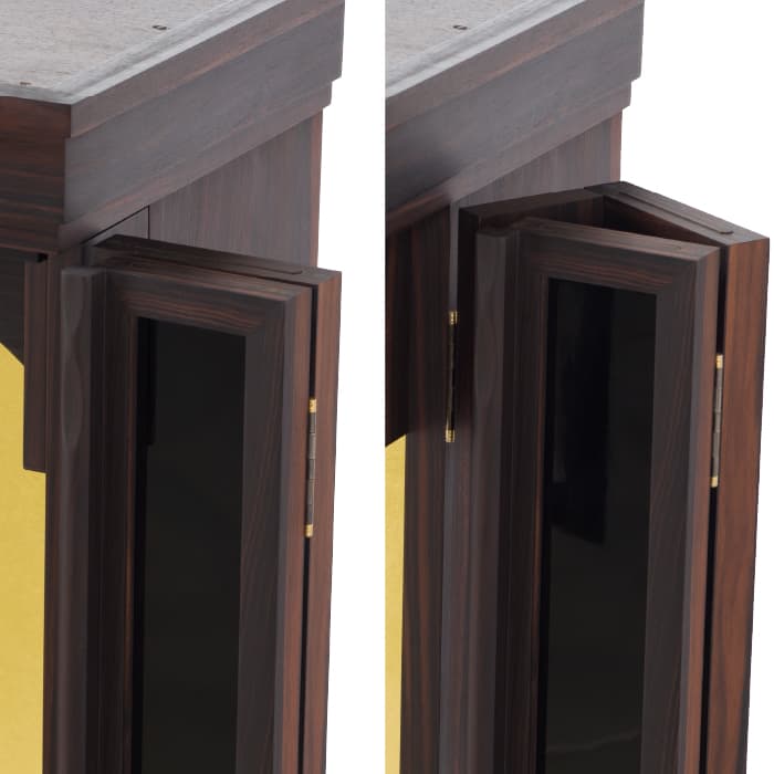 前面の扉のみを開くことができるほか、正三方開きもできます。正三方開きは上からみると△(三角)になる扉の開きかた。両側面の前側が開くから、斜めや左右に座られる方も御本尊様を拝しやすいようになっています。